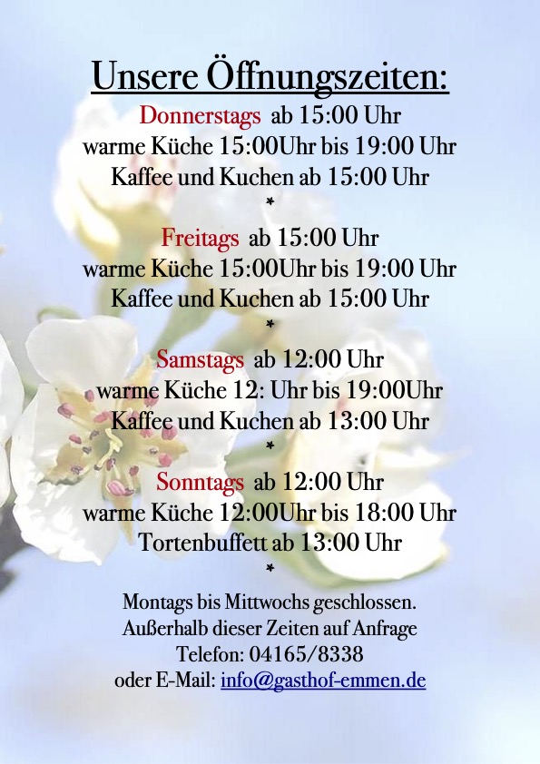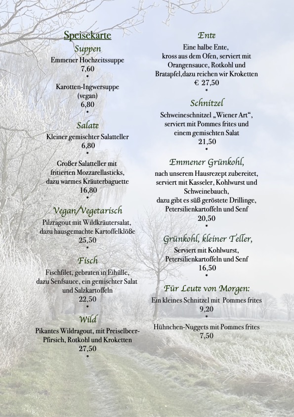 führt unsere Familie diesen Gasthof im schönen Estetal. Umgeben von Apfelbäumen und Buchenhecken liegt unser großer Garten, der im Sommer den Rahmen für festliche Empfänge ebenso wie für Grillbuffets oder Kaffeerunden bietet. Jede Jahreszeit hat ihre besondere Stimmung und natürlich kann man in Emmen immer zu einem Spaziergang aufbrechen.